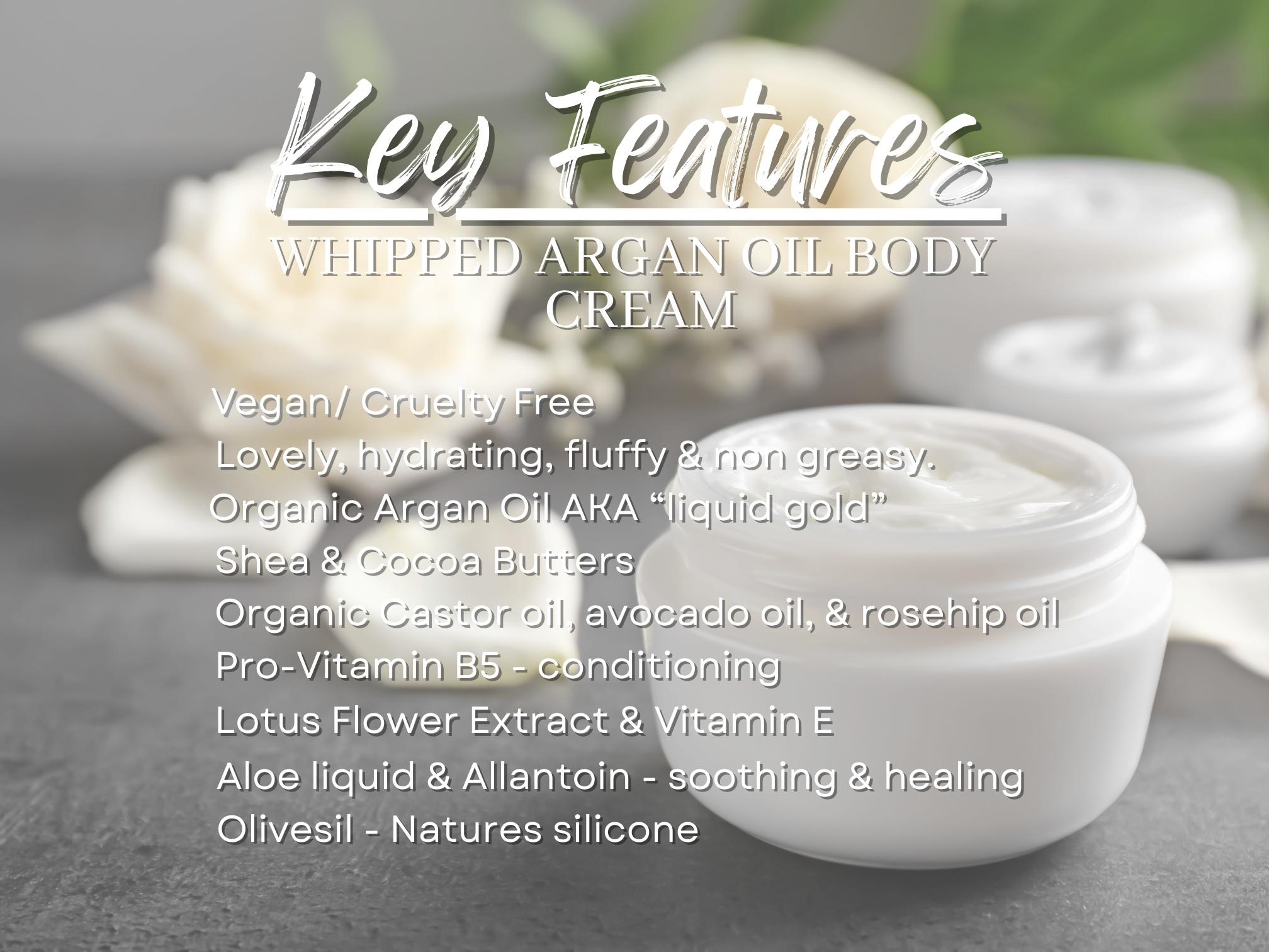 Give your skin the ultimate treat with our Whipped Argan Oil Body Butter Cream. Specially crafted to combat dryness, this rich, velvety body butter is packed with nourishing ingredients designed to lock in hydration and leave your skin feeling soft, supple, and protected from the elements. Net Weight: 4oz by Volume / 5oz by Weight (150g)