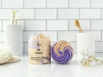 Our whipped soap and shave cream is light, fluffy, creamy and easy to use. Swirls of purple, light purple and gold shimmer with extra shimmer mica on top. The luxurious lather makes it perfect for an indulgent cleansing experience and a smooth, nick-free shave. MADE IN HOUSE. (WE NEVER USE A PREMADE BASE!)