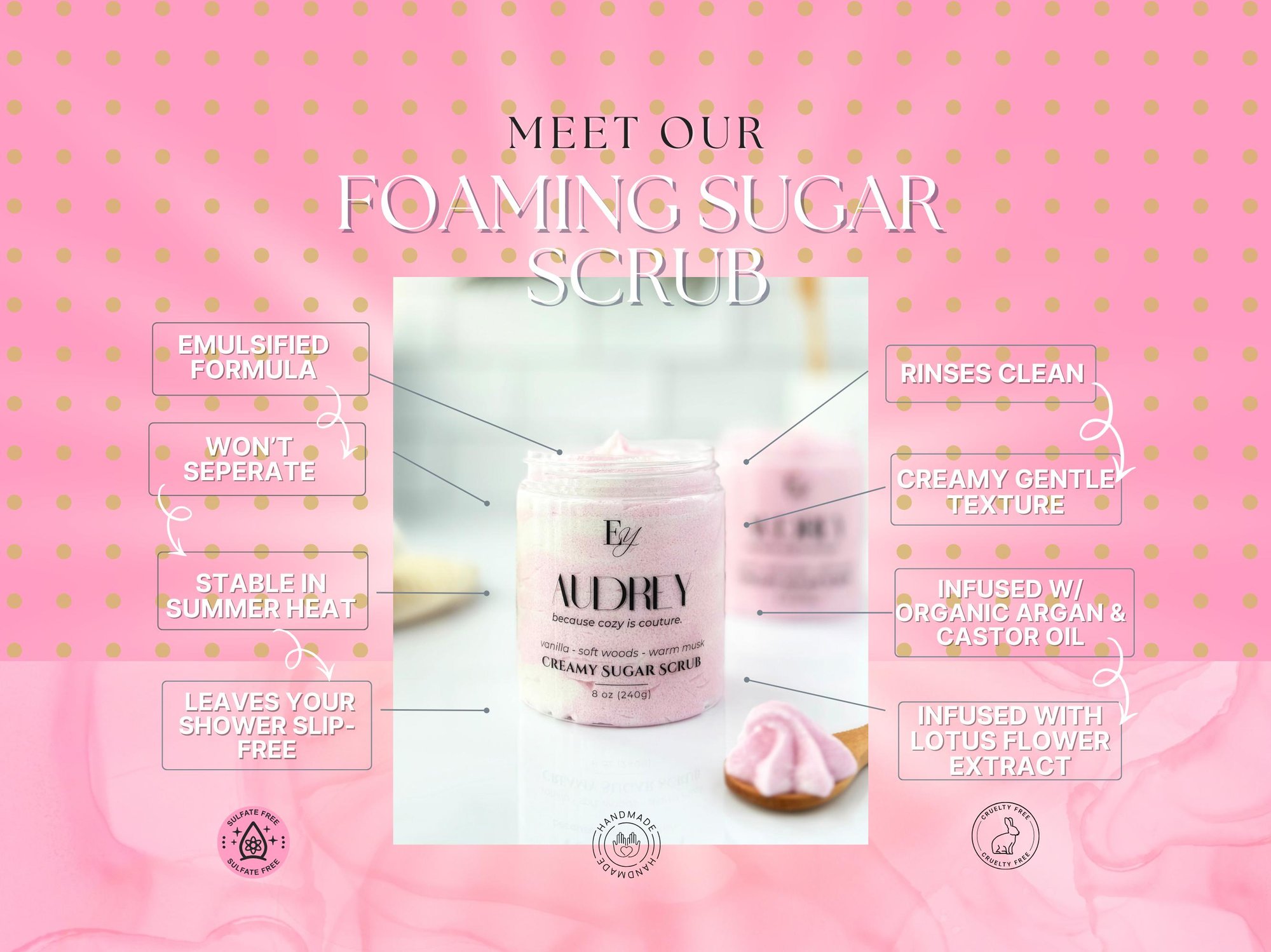 Whipped Soap Ingredients: Distilled water, glycerin, sodium cocoyl isethionate, cocamidopropyl betaine, stearic acid, organic argan oil, organic castor oil, fragrance, optiphen plus, lotus flower extract, and/or mica.
