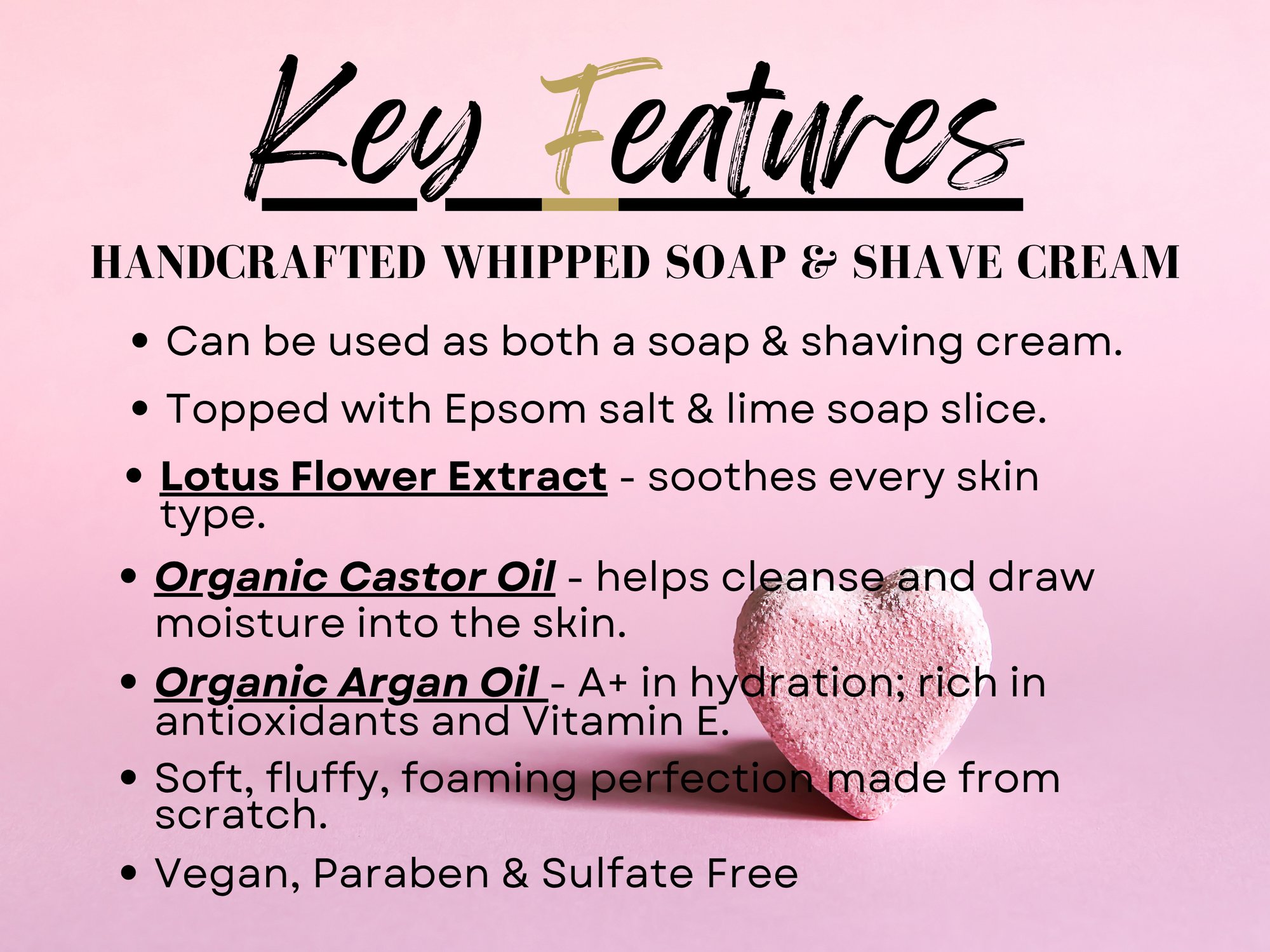 INGREDIENTS: Distilled water, glycerin, cocamidopropyl betaine, sodium cocoyl isethionate, stearic acid, organic argan oil, organic castor oil, Shea butter, kaolin clay, tapioca starch, fragrance, optiphen plus, lotus flower extract, Sodium Chloride, Titanium Dioxide, Sugar (to mimic salt rim) & mica.
