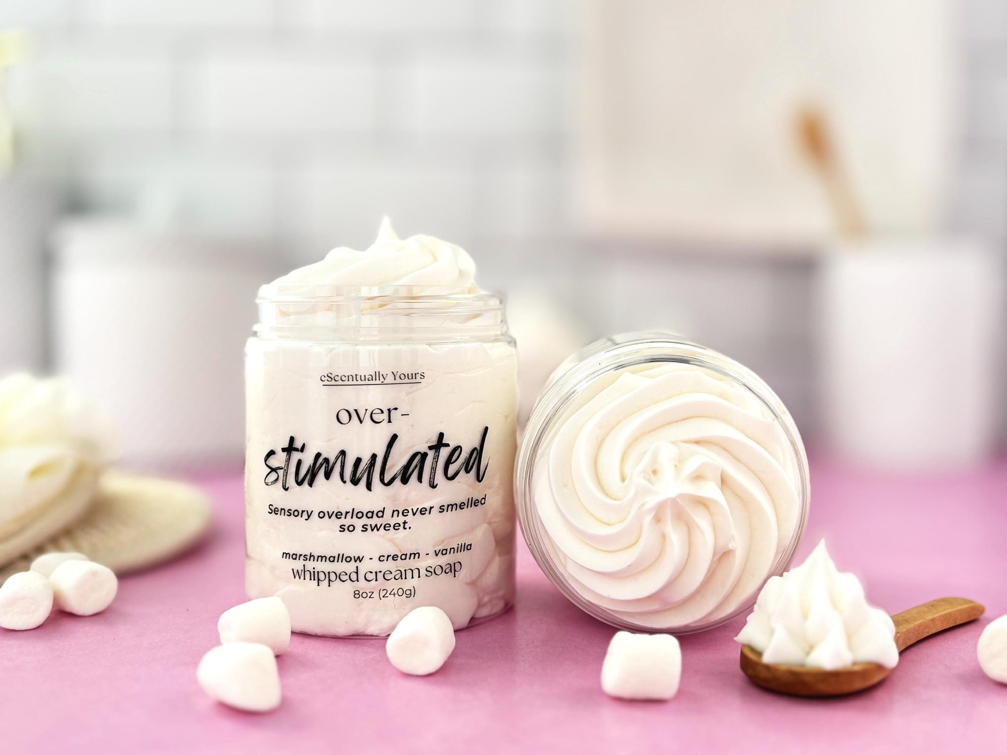 Marshmallow Fluff Whipped Cream Soap or Foaming Sugar Scrub. Your choice of standard label or "overstimulated: sensory overload never smelled so sweet." label.