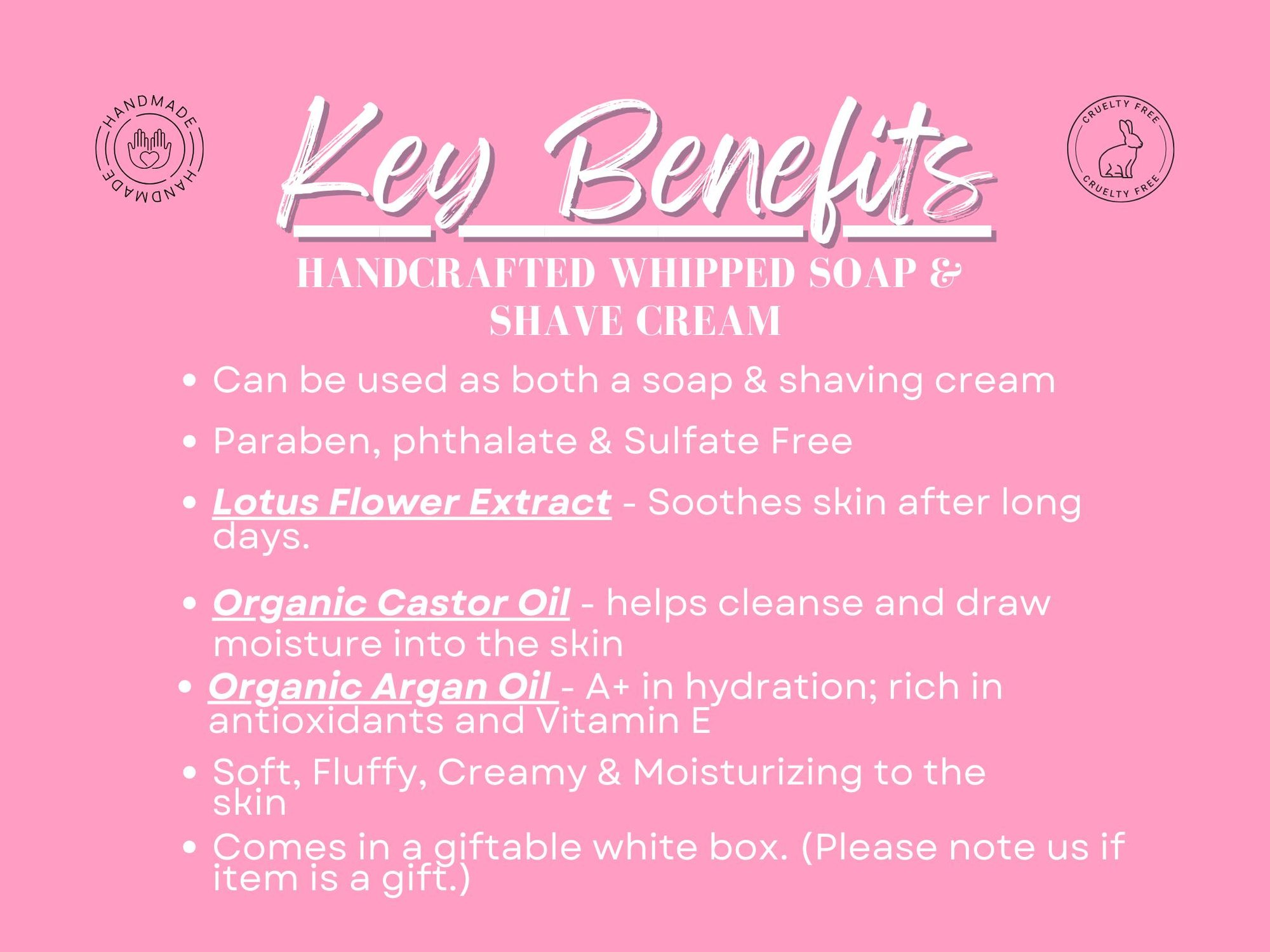 Whipped Soap Ingredients: Sodium Cocoyl Isethionate, Glycerin, Cocamidopropyl Betaine, Aqua (Water), Argania Spinosa (Argan) Kernel Oil, Ricinus Communis (Castor) Seed Oil, Butyrospermum Parkii (Shea) Butter, Stearic Acid, Parfum (Fragrance), Nelumbo Nucifera (Lotus) Flower Extract, Kaolin, Tapioca Starch, Phenoxyethanol (and) Caprylyl Glycol (and) Sorbic Acid. (Paraben Free Preservative), Sodium Chloride, Titanium Dioxide.