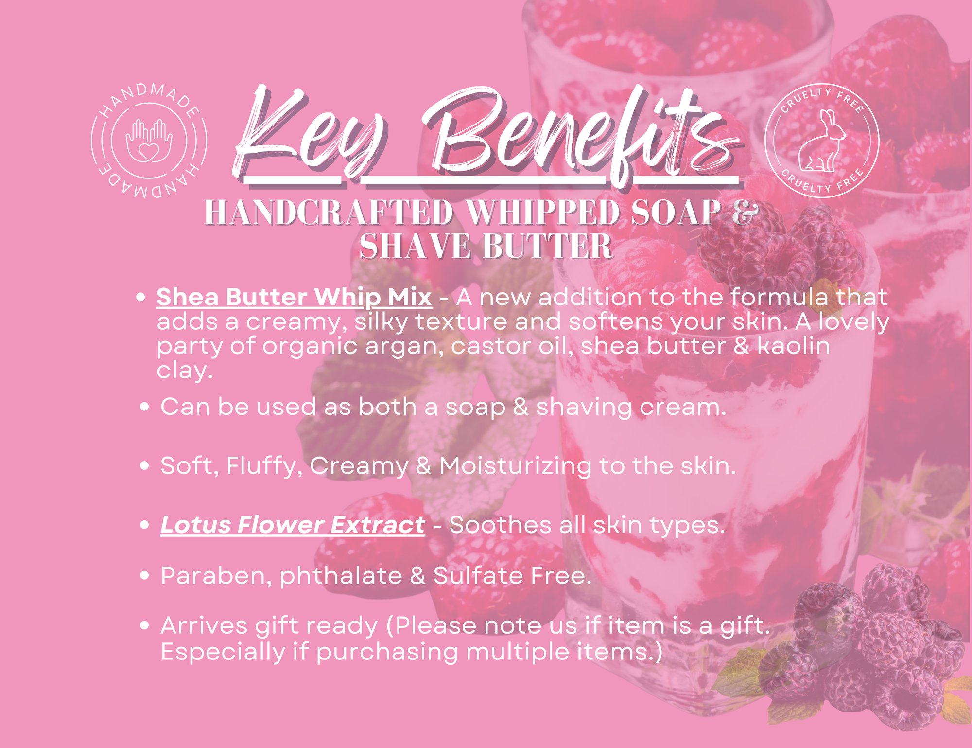 Whipped Soap Ingredients: Sodium Cocoyl Isethionate, Glycerin, Cocamidopropyl Betaine, Aqua (Water), Argania Spinosa (Argan) Kernel Oil, Ricinus Communis (Castor) Seed Oil, Butyrospermum Parkii (Shea) Butter, Stearic Acid, Parfum (Fragrance), Tapioca Starch, Kaolin, Nelumbo Nucifera (Lotus) Flower Extract, Phenoxyethanol (and) Caprylyl Glycol (and) Sorbic Acid. (Paraben Free Preservative), Sodium Chloride, Titanium Dioxide.