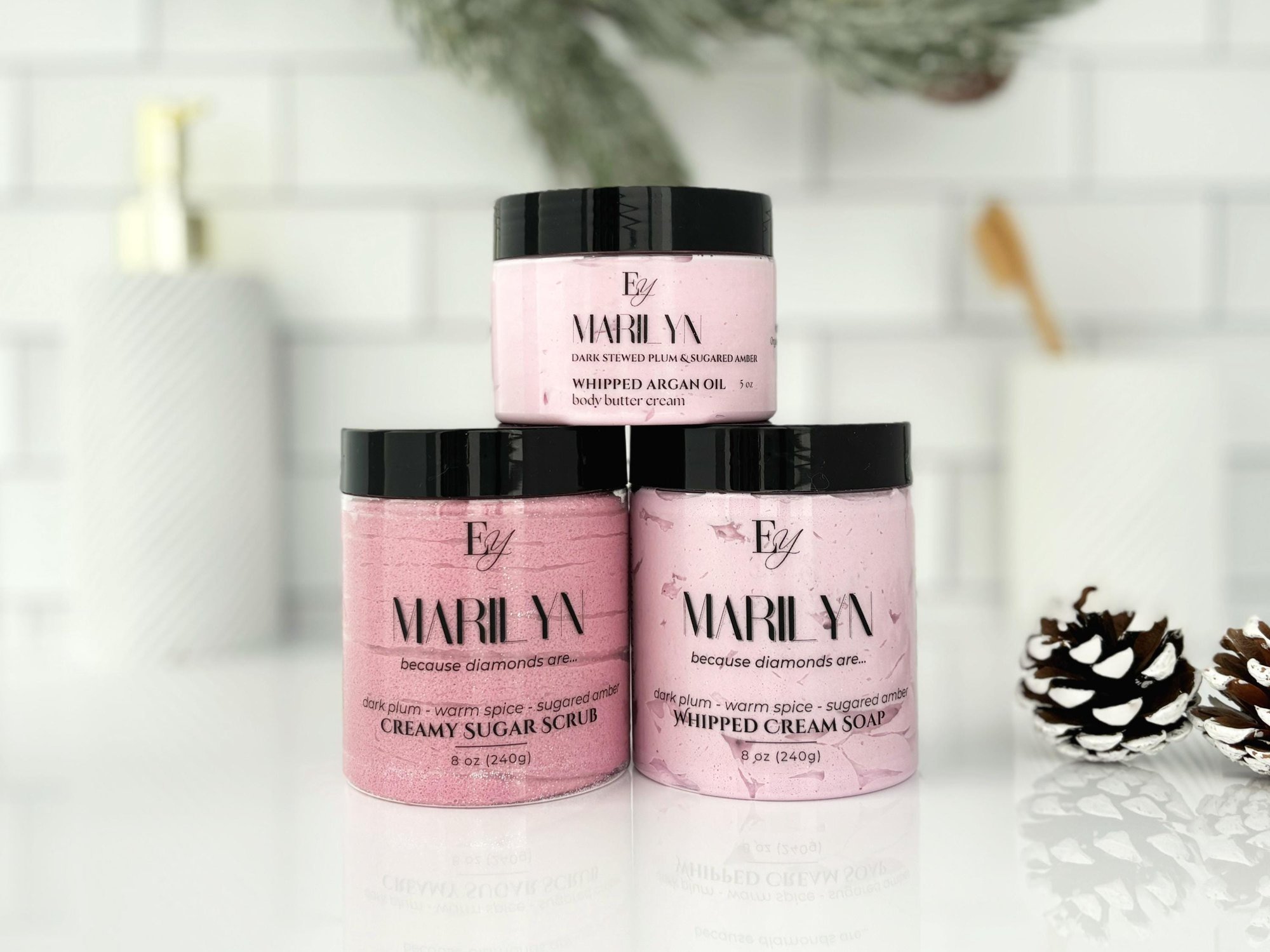 Introducing Marilyn, the starlet of the season. This intoxicating scent begins with dark plum and golden honey, swirling through the air like a stolen glance beneath soft lights. Crushed walnut and butter-warmed spice hint at holiday indulgence - rich, nostalgic, and irresistibly warm. As the night deepens, creamy vanilla and cinnamon melt into ambered sweetness, glowing like sugar caramelized by candlelight.