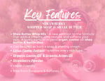 Whipped Soap Ingredients: Sodium Cocoyl Isethionate, Glycerin, Cocamidopropyl Betaine, Aqua (Water), Argania Spinosa (Argan) Kernel Oil, Ricinus Communis (Castor) Seed Oil, Shea Butter, Stearic Acid, Parfum (Fragrance), Kaolin Clay, Tapioca Starch, Nelumbo Nucifera (Lotus) Flower Extract, Phenoxyethanol (and) Caprylyl Glycol (and) Sorbic Acid. (Paraben Free Preservative) Titanium Dioxide, strawberry powder, organic beetroot powder.