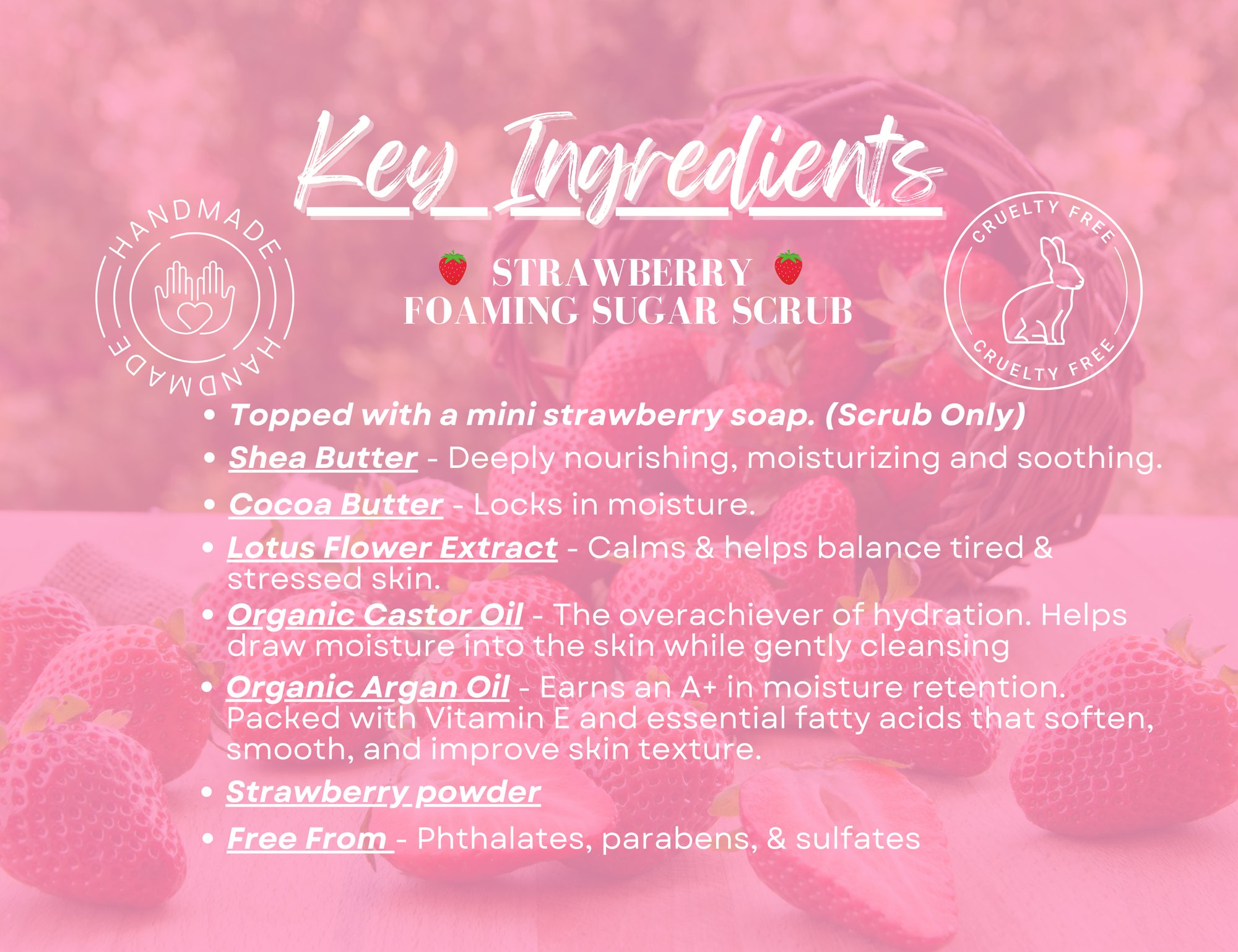 Scrub Ingredients: Sucrose, Sodium Cocoyl Isethionate, Glycerin, Cocamidopropyl Betaine, Parfum (Fragrance), Aqua (Water), Butyrospermum Parkii (Shea) Butter, Stearic Acid, Theobroma Cacao (Cocoa) Seed Butter, Argania Spinosa (Argan) Kernel Oil, Ricinus Communis (Castor) Seed Oil, Cetearyl Alcohol (and) Polysorbate 60, Nelumbo Nucifera (Lotus) Flower Extract, Phenoxyethanol (and) Caprylyl Glycol (and) Sorbic Acid. (Paraben Free Preservative), strawberry powder, organic beetroot powder, Titanium Dioxide.