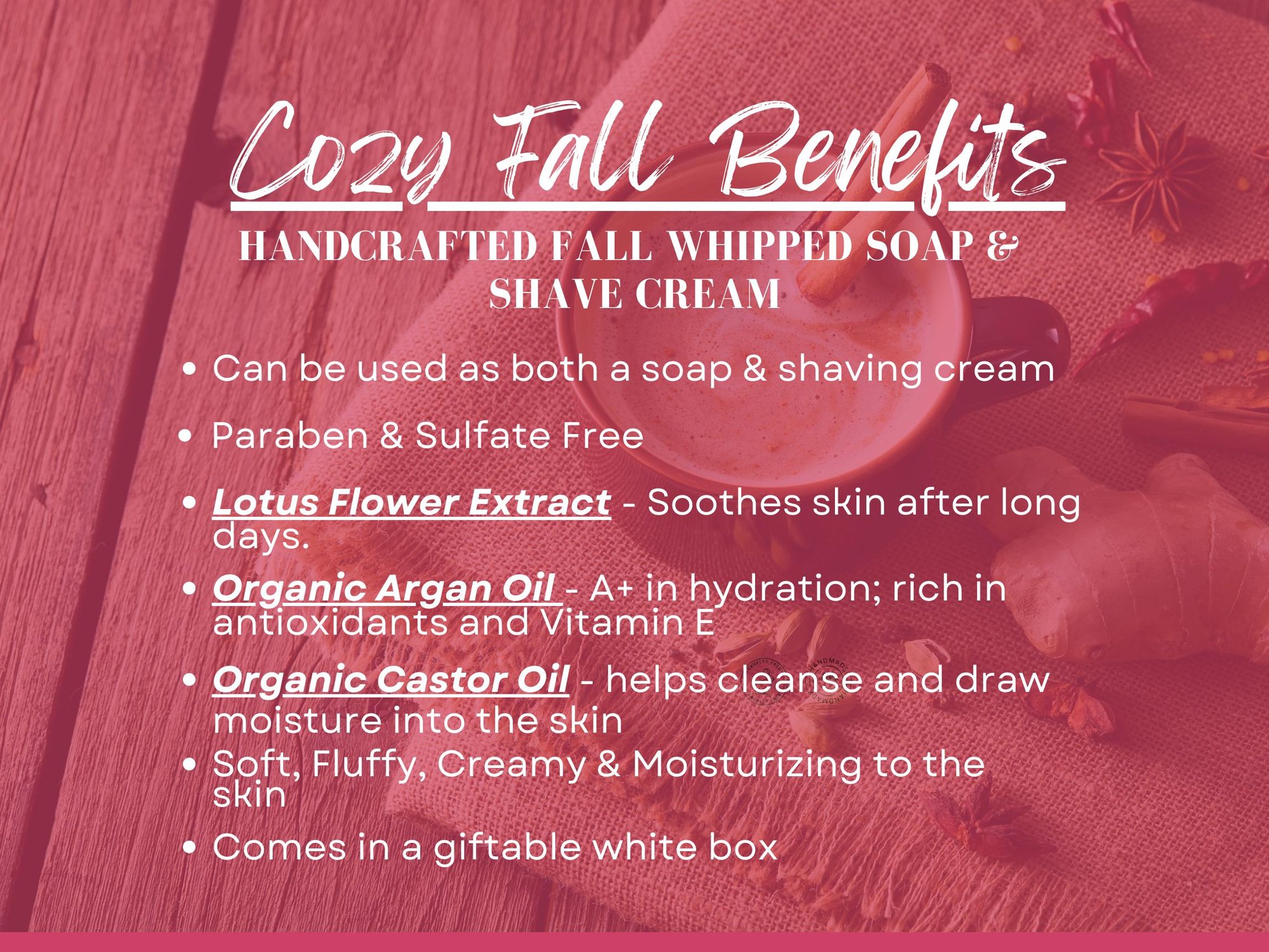 Whipped Soap – A fluffy, creamy cleanser that doubles as a shave cream. Made with organic argan oil, organic castor oil, and lotus flower extract to nourish and hydrate.