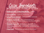 Whipped Soap Ingredients: Sodium Cocoyl Isethionate, Glycerin, Cocamidopropyl Betaine, Aqua (Water), Argania Spinosa (Argan) Kernel Oil, Ricinus Communis (Castor) Seed Oil, Stearic Acid, Parfum (Fragrance), Butyrospermum Parkii (Shea) Butter, kaolin Clay, tapioca flour, Nelumbo Nucifera (Lotus) Flower Extract, Phenoxyethanol (and) Caprylyl Glycol (and) Sorbic Acid. (Paraben Free Preservative)