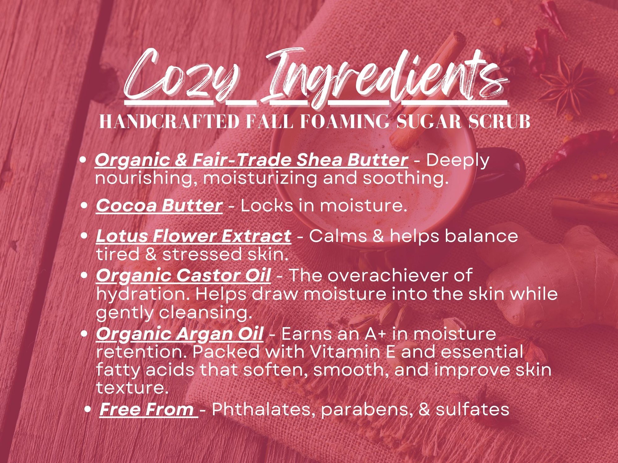 Scrub Ingredients: Sucrose, Sodium Cocoyl Isethionate, Glycerin, Cocamidopropyl Betaine, Parfum (Fragrance), Aqua (Water), Butyrospermum Parkii (Shea) Butter, Stearic Acid, Theobroma Cacao (Cocoa) Seed Butter, Argania Spinosa (Argan) Kernel Oil, Ricinus Communis (Castor) Seed Oil, Cetearyl Alcohol (and) Polysorbate 60, Nelumbo Nucifera (Lotus) Flower Extract, Phenoxyethanol (and) Caprylyl Glycol (and) Sorbic Acid. (Paraben Free Preservative)