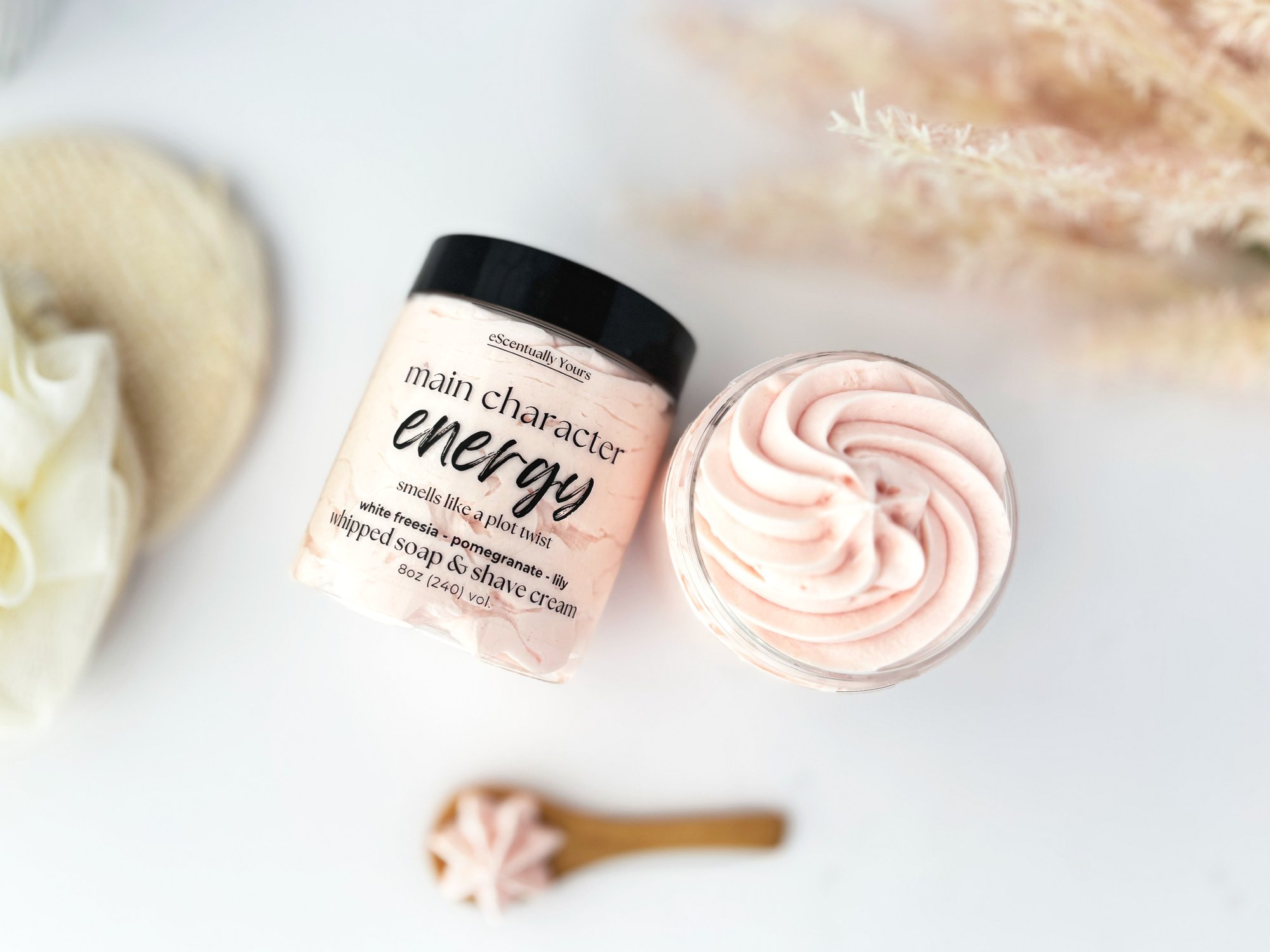 White Freesia & Lily Whipped Cream Soap or Foaming Sugar Scrub. Your choice of standard label or "main character energy: smells like a plot twist." label.