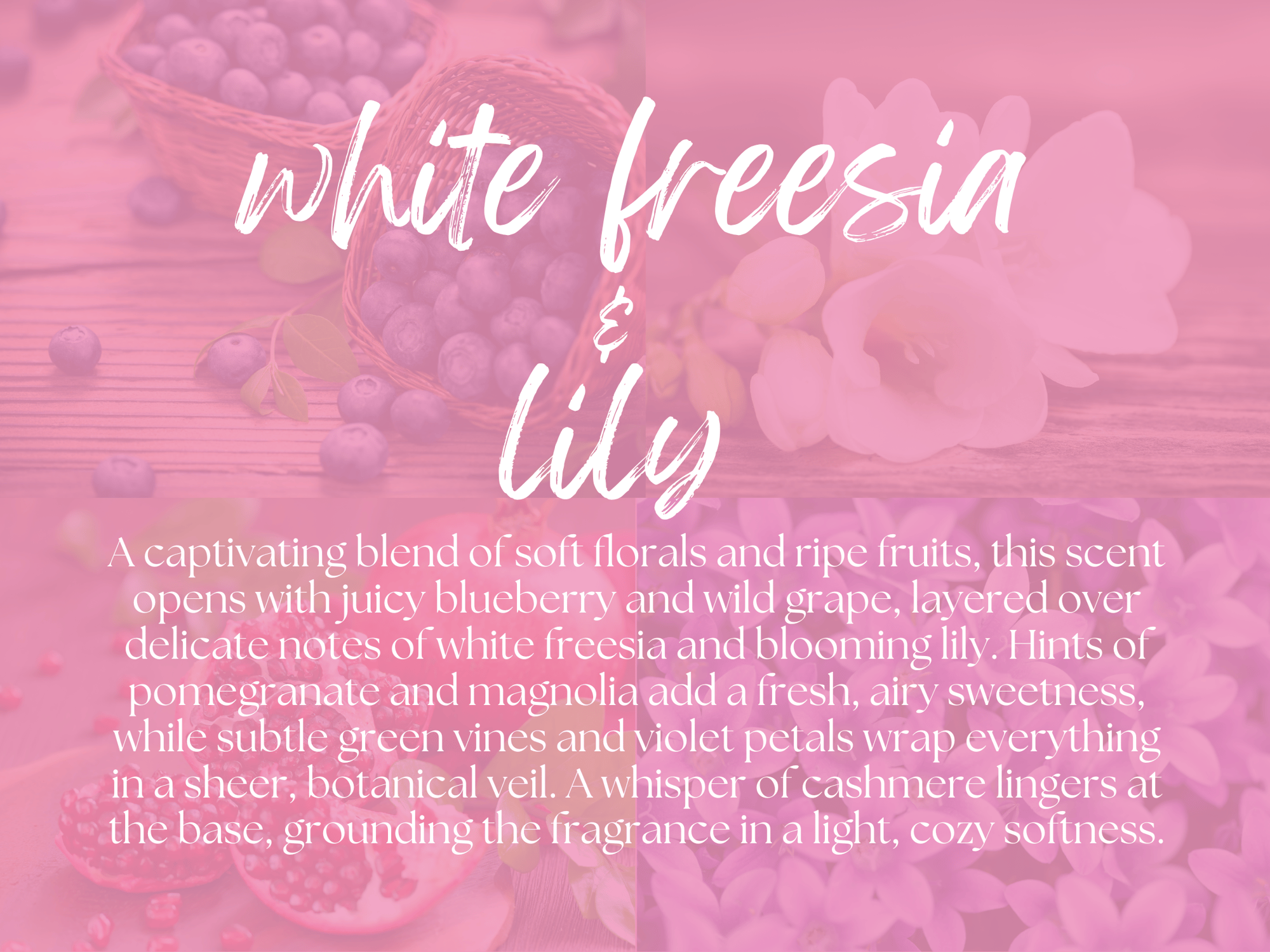 A captivating blend of soft florals and ripe fruits, this scent opens with juicy blueberry and wild grape, layered over delicate notes of white freesia and blooming lily. Hints of pomegranate and magnolia add a fresh, airy sweetness, while subtle green vines and violet petals wrap everything in a sheer, botanical veil. A whisper of cashmere lingers at the base, grounding the fragrance in a light, cozy softness you’ll want to wear every day. This scent is lovely. It's a soft, delicate, light, bright and airy fragrance. Phthalate free as always.
